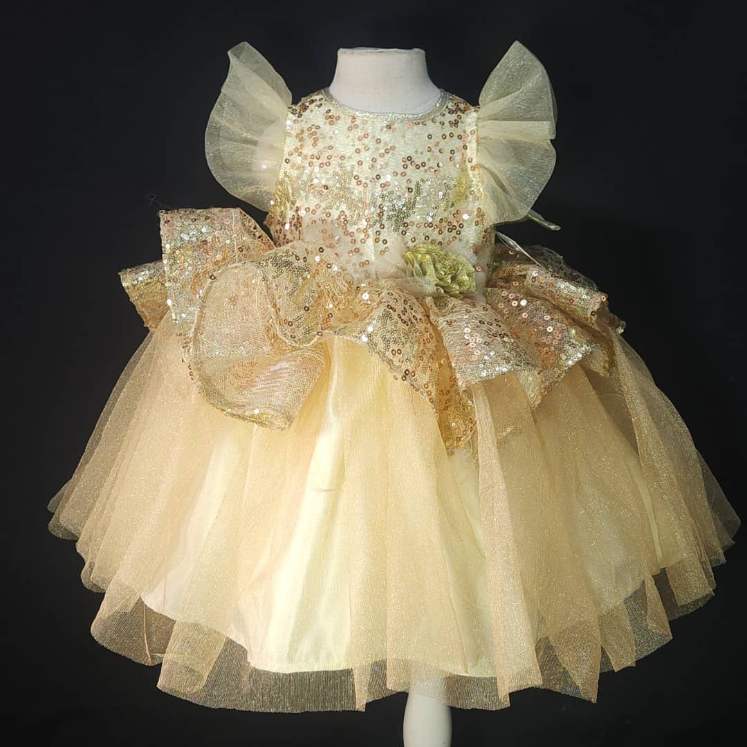 Enchanting gold sequin dress for little princesses. This puff-sleeve tulle party gown features a shimmering bodice, oversized glitter bow,and layered organza skirt. Perfect for birthdays, special occasions and Christmas